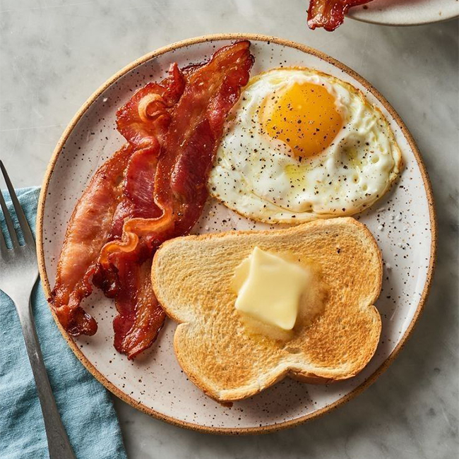 2 Huevos fritos, bacon, tostadas con tomate