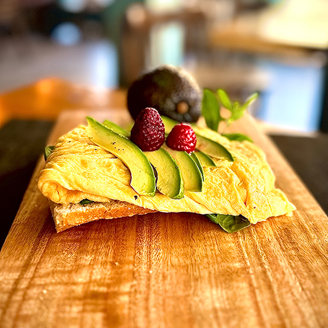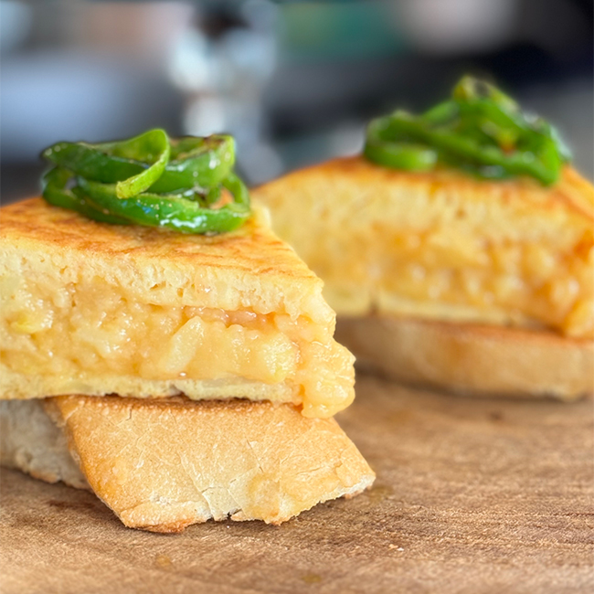 Tomate tortilla francesa con queso y aguacate laminado
