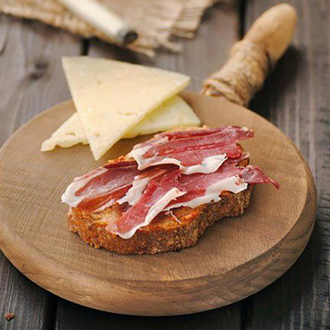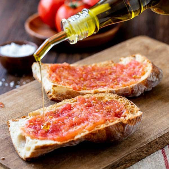 Tosta jamón ibérico sobre salmorejo y aceite de oliva virgen extra